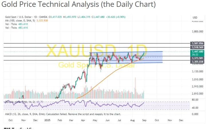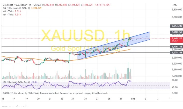 24K99讯 周一(9月1日)亚市早盘,现货黄金在上一交易日大涨后基本持稳,目前金价位于3445美元/盎司附近。知名财经网站FXDailyReport分析师Nicholas Kitonyi周五撰文,对黄金后市走势进行分析。