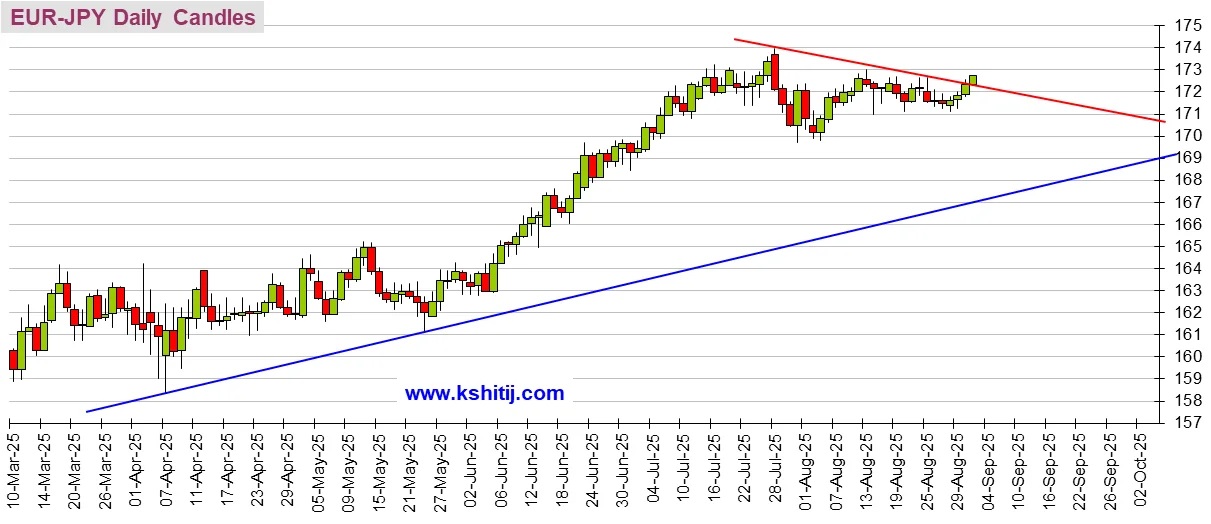欧元/日元在171-173区间内走高。如果突破173,短期内可能会测试174的阻力位。