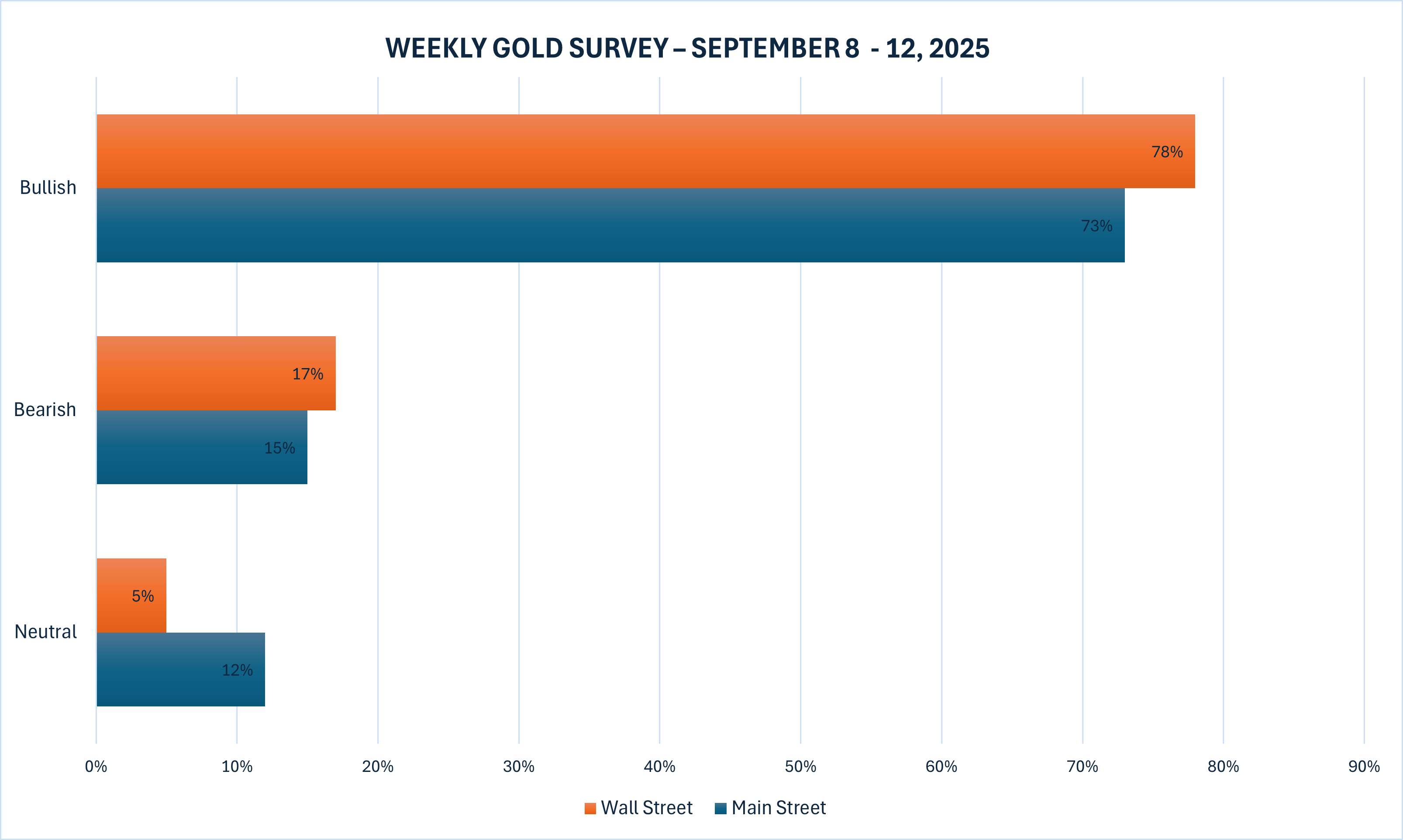 Kitco News黄金周度调查显示,华尔街分析师与Main Street投资者均展现出压倒性看涨情绪: