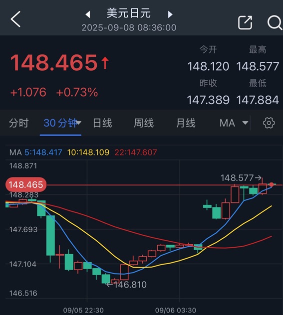 美元/日元大幅跳空高开,目前该货币对上涨近110点,涨幅逾0.7%,位于148.50附近。