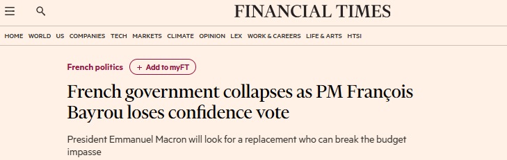 FX168财经报社(亚太)讯 英国《金融时报》报道称,法国总理弗朗索瓦·贝鲁(François Bayrou)周一(9月8日)在信任投票中落败,导致其执政仅九个月的政府下台,并给总统马克龙(Emmanuel Macron)带来更大压力,迫使他遏制不断升级的政治危机。