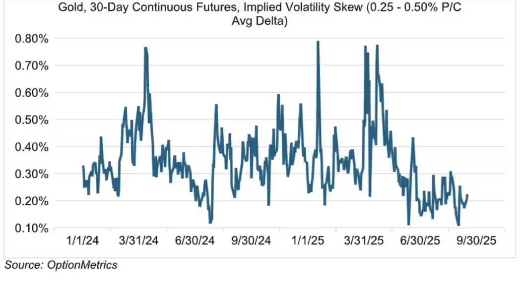 他指出,金融泡沫确实存在,但极为罕见。对于毫无保留的泡沫论断“应保持高度怀疑”。如果黄金真的处于泡沫之中,期权隐含波动率会升高,反映更大的不确定性和狂热的价格行为;而虚值期权相对于平值期权会变得更昂贵。
