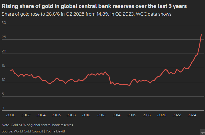 过去一个月金价的指数式上涨使新兴市场央行几乎无需额外行动,也能继续实现其“提升黄金在外汇储备中占比”的共同目标。