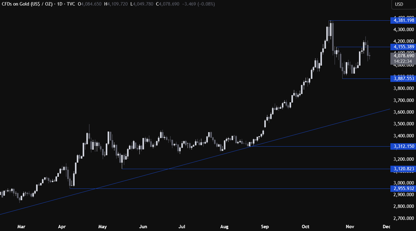 在日线图上,可以看到黄金无法维持突破4155的水平,并最终抹去几乎所有的周涨幅。从风险管理的角度来看,买家将有更好的风险在主要趋势线附近进行奖励设置,为反弹到新的历史高点做准备。另一方面,卖家希望看到价格跌破主要趋势线,从而进一步下跌至3312美元。