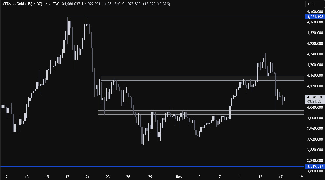 黄金在空头回补行情结束后几乎抹去了所有周内涨幅。从基本面来看,整体并无变化,不过上周末市场对 12 月降息概率的预期降至 40%。市场参与者继续等待美国关键经济数据的公布,以判断 12 月 FOMC 会议的结果。