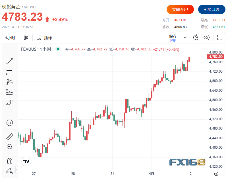 FX168财经报社(北美)讯 周三(4月1日),现货黄金(XAU/USD)延续前一交易日的强劲涨势,整体维持温和上行格局。随着市场对美以与伊朗冲突可能较快结束的预期升温,黄金价格进一步走高。