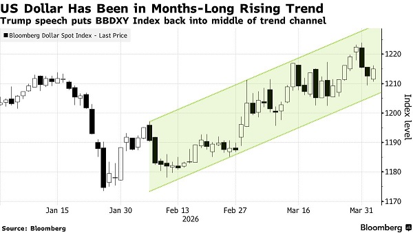 如果特朗普除了把问题推给他人,并抱持一种“霍尔木兹海峡会自然重新开放”的乐观设想之外,没有提出任何具体方案,那么彭博美元指数回升至1222并不令人意外。