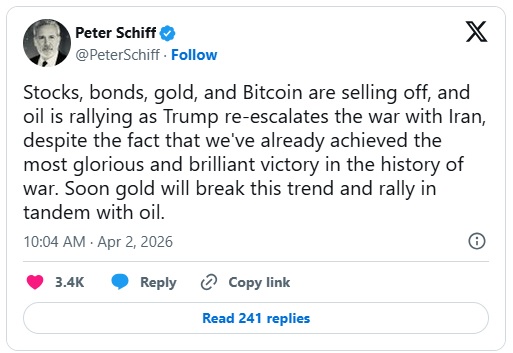 尽管出现下跌,并且在4月1日和2日因美国总统特朗普(Donald Trump)最新电视讲话引发进一步回落,美国顶级经济学家彼得·希夫(Peter Schiff)在周三晚间发表于X平台的帖子中表示,黄金走势即将出现反转。