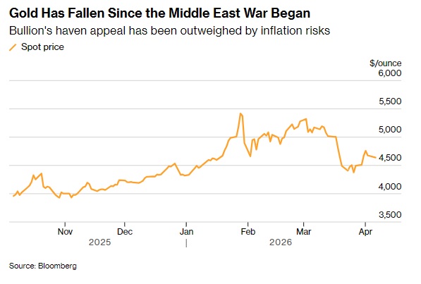 自2月下旬冲突爆发以来,金价已下跌超过12%。能源价格飙升加剧通胀担忧,并降低降息的可能性,而降息通常有利于无收益的贵金属。