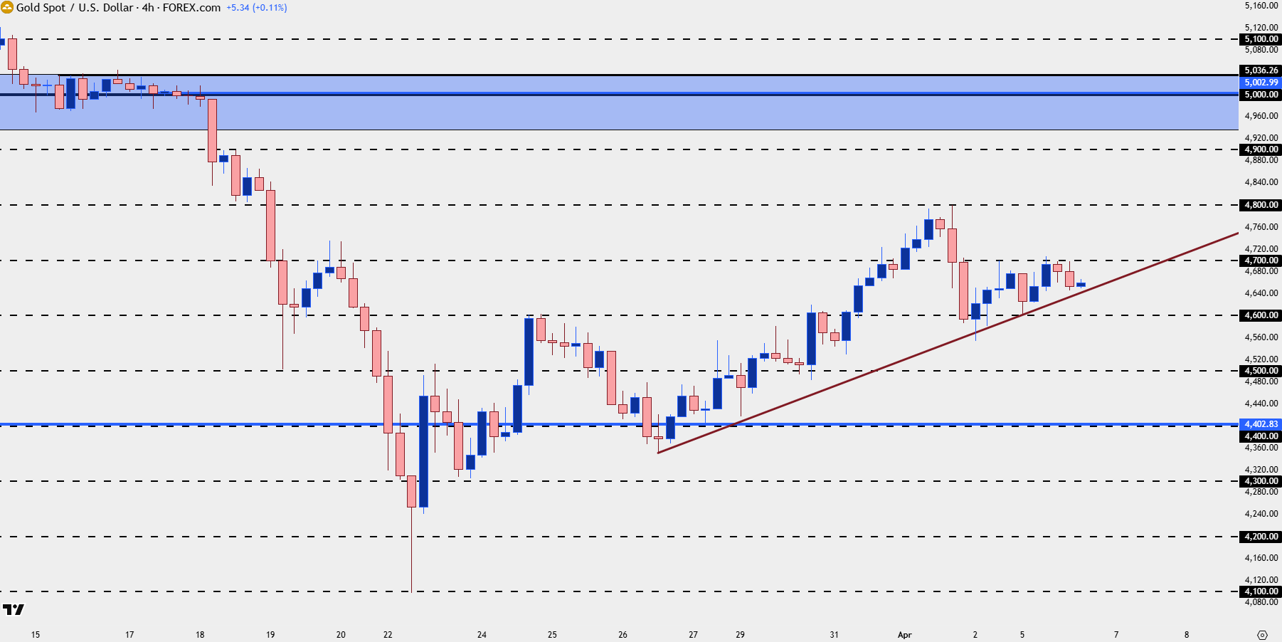 在3月下跌过程中,金价分别在4500美元和4100美元附近出现停顿或反弹,而4600美元和4800美元则构成阻力。这就形成了当前的技术格局:4600美元处支撑得到确认,显示出“此前阻力转化为当前支撑”的特征,同时也体现出短线看涨结构——即在近期更高的高点之后形成了更高的低点。