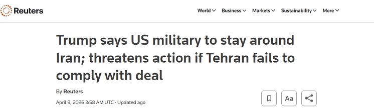 特朗普在其“Truth Social”平台上表示:“所有美国舰船、飞机和军事人员,以及额外的弹药和武器……都将继续部署在伊朗境内及其周边地区,直到达成的真正协议得到完全遵守为止。”