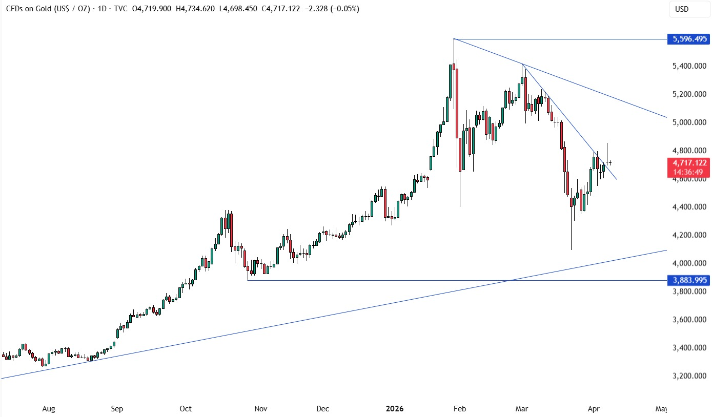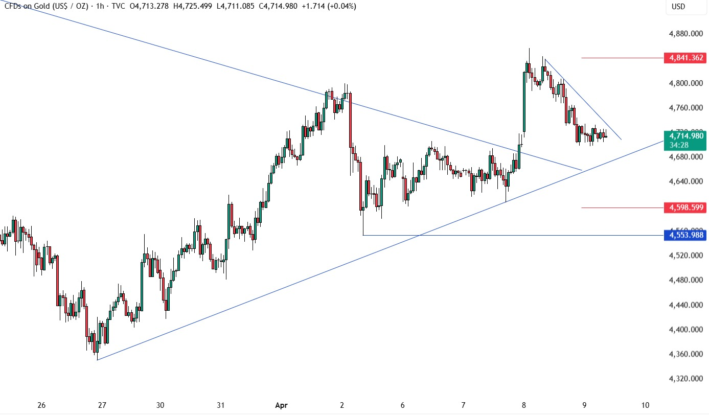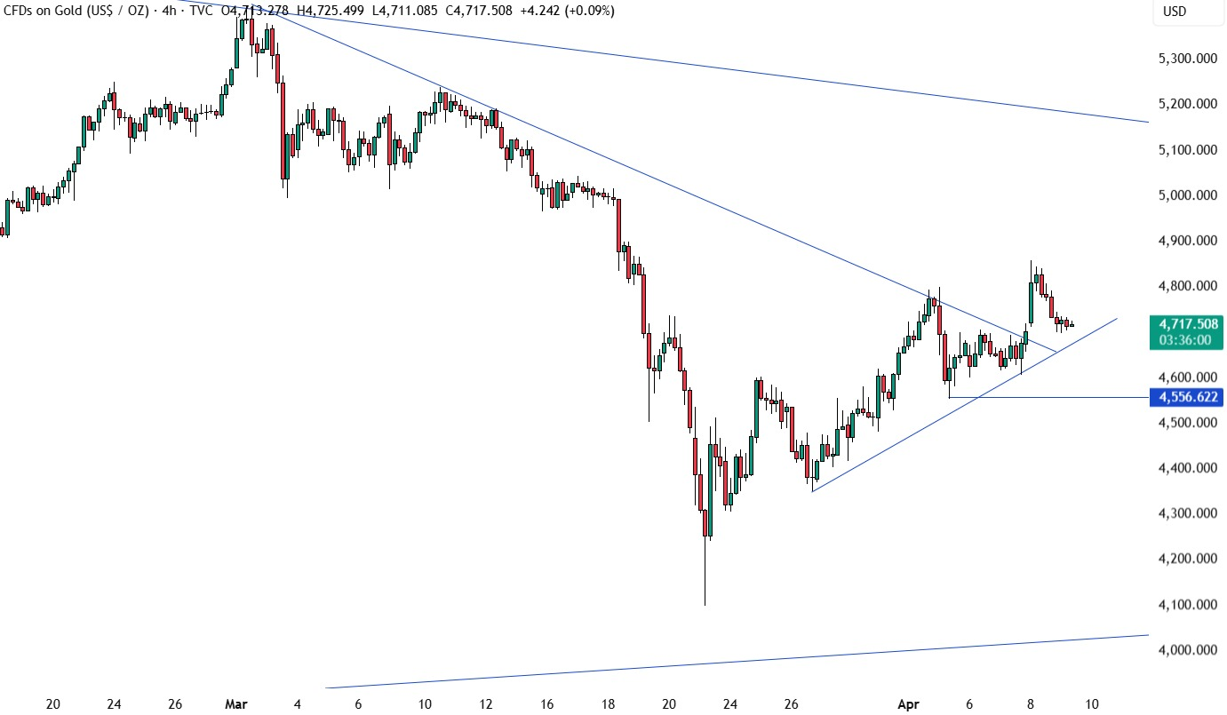 目前,停火仍在维持,至少会持续到明天,届时美伊谈判将在伊斯兰堡举行。如果双方同意,谈判也可能延长。由于美国和伊朗尚未正式结束敌对状态,冲突仍有可能随时重新爆发。尽管如此,黄金的短期倾向已转为更偏多,因为交易员正在重新定价此前偏鹰派的预期。不过话虽如此,如果谈判失败、战争重启,市场情绪也可能迅速逆转。