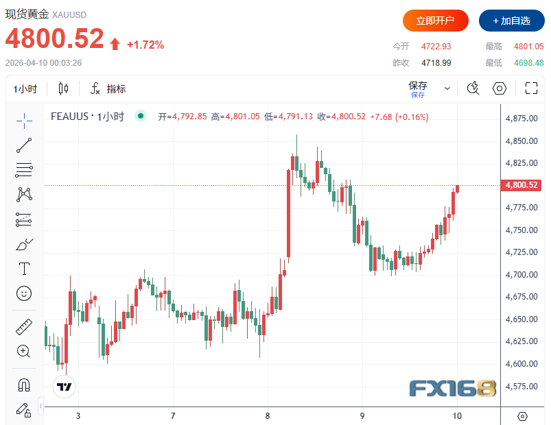 FX168财经报社(北美)讯 周四(4月9日),黄金震荡上涨,市场正密切关注中东脆弱停火局势的进一步发展。美市盘中,现货黄金持续攀升并刷新日高至4801.05美元/盎司,原因是市场对美伊停火协议持久性的疑虑有所降温。