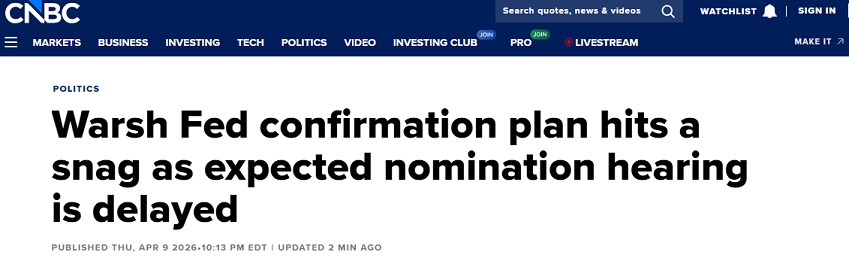 FX168财经报社(亚太)讯 美国消费者新闻与商业频道(CNBC)周五(4月10日)最新报道称,据知情人士周四晚间告诉CNBC,美联储主席候选人凯文·沃什(Kevin Warsh)的预期提名听证会已被推迟。